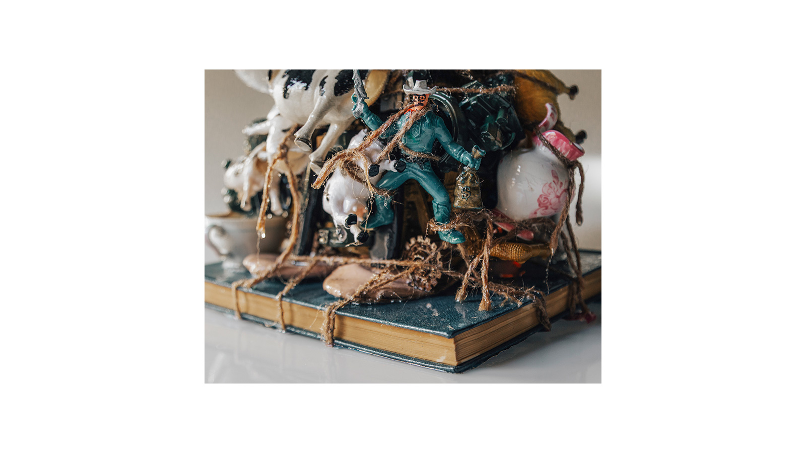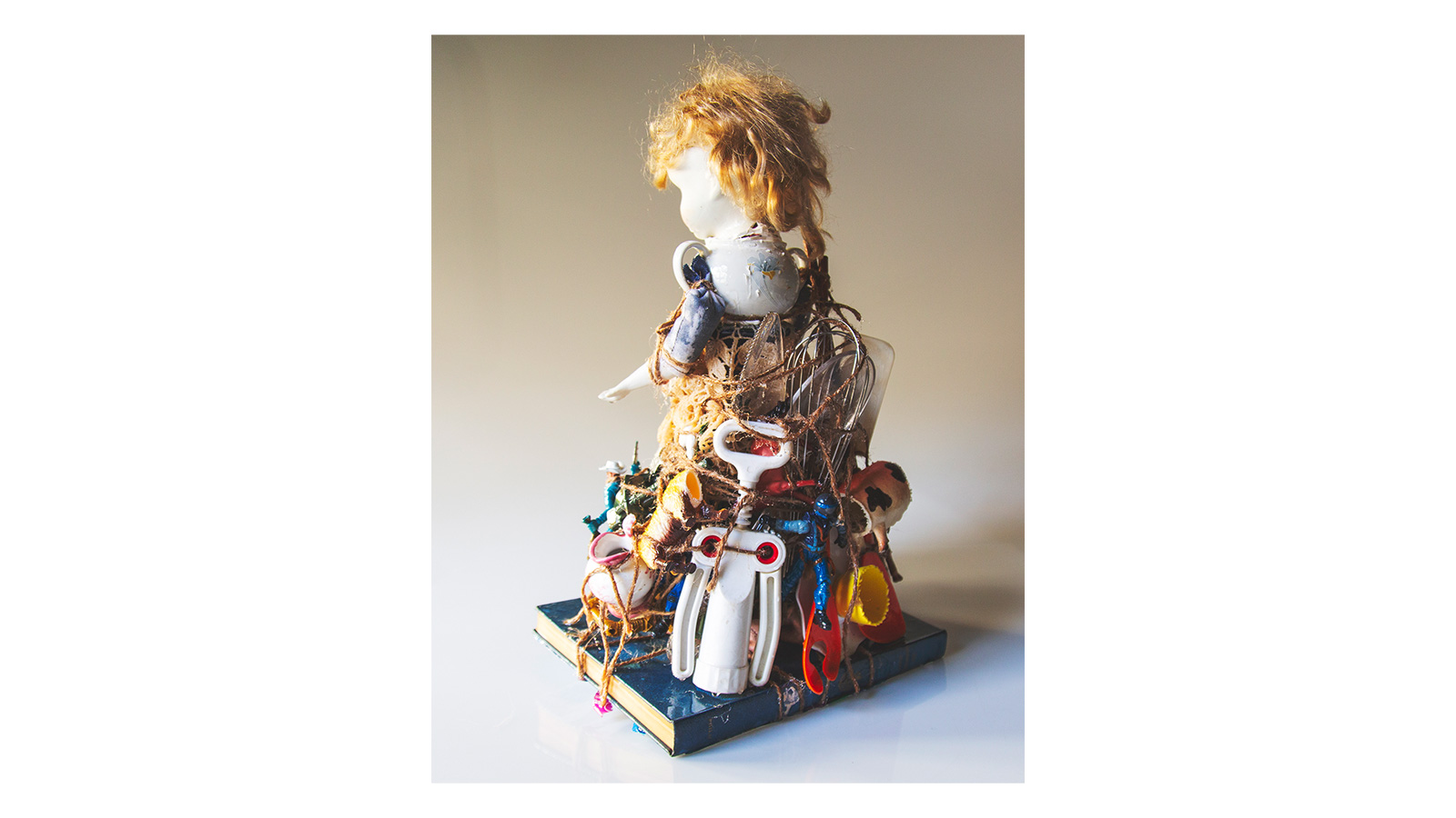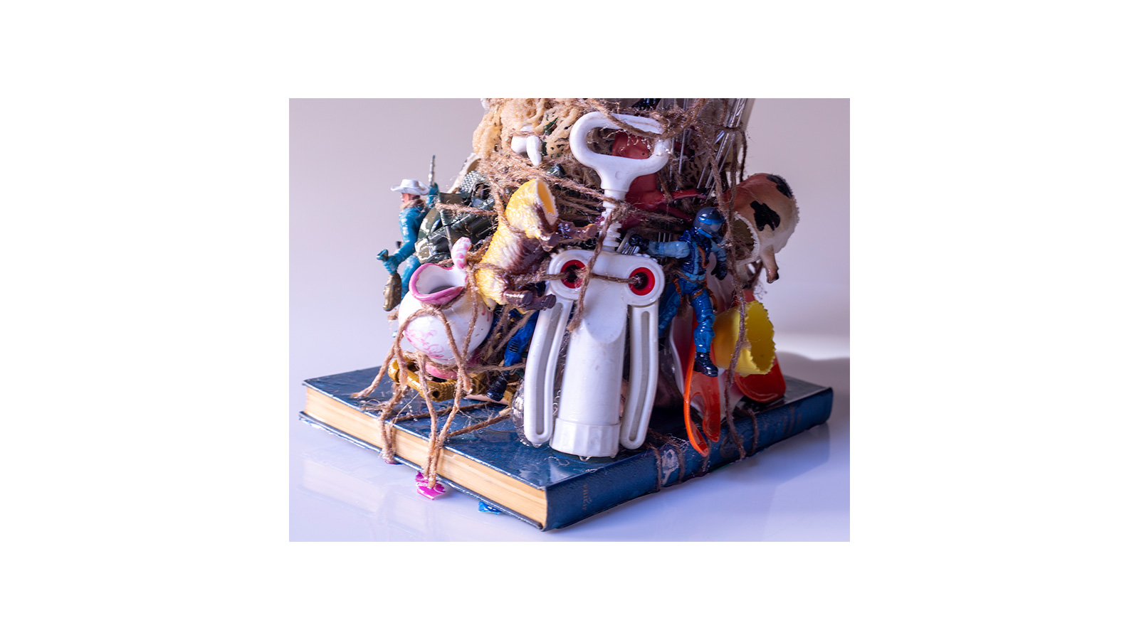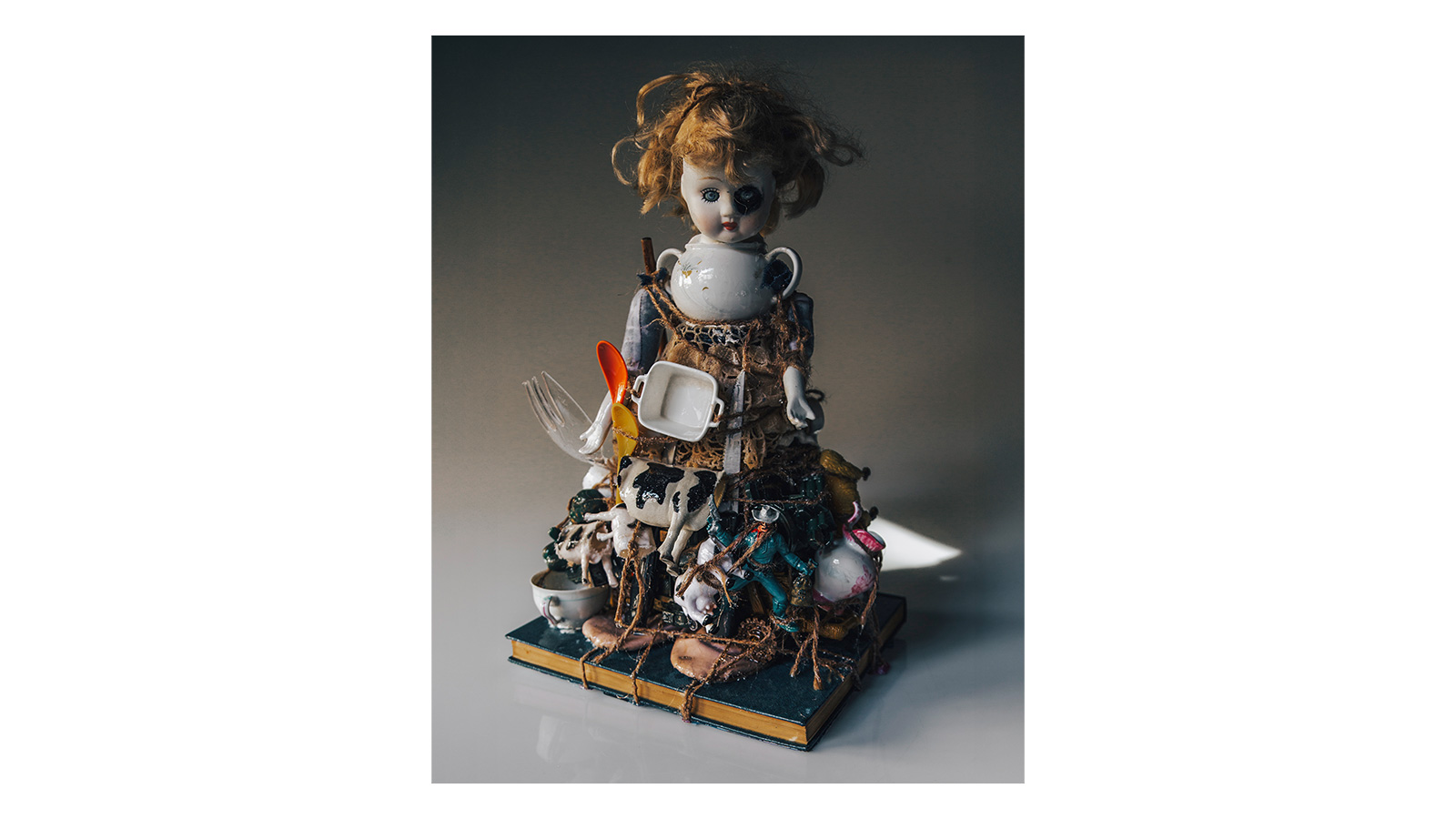 Mixed media (found objects: toys, kitchenware), ballet shoes, book (for stand), coated with resin