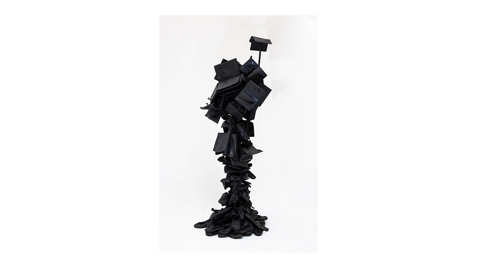 War dreams is a conceptual contemplation on the fragments of lives and hopes in the face of war. Shoes, books and toys dot mountains of rubble and ruins in post-apocalyptic scenes following missile strikes. Such images sparked the content and appearance of the work. Reminiscent of Holocaust images of heaps of shoes signifying horror and absence, War dreams uses shoes as symbols of death and loss. Shoes suggest the physical bodies of their wearers, and also their absence, and the soil in which life and toil happened. In the work, a flutter of books makes up the top half of the sculpture to create a totem-like appearance. Books remind us that we are storied beings, and are the repositories of our heritage, culture and history. War dreams alludes to the destruction of libraries, personal book collections and with this, the loss of stories and memories. The books in the work are stalled in time, having become illegible yet expressive of the anguish of such loss. The toys that are visible in sections of the work remind us of the plight of the most vulnerable, and war’s indiscriminate massacre of the innocents.